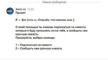 С помощью сервиса читатели Amic.ru "ВКонтакте" смогут подписаться на новости (как на главные, так и на новости наших рубрик), сообщить о ЧП или происшествии и отправить фото или видео администратору Amic... amic.ru »