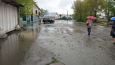 После дождя в Бийске появились желтые лужи с пеной, сообщает «Бийский рабочий».