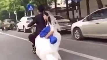 Фото: скриншот с экрана В сети появилось видео, на котором китайские молодожены едут на скутере. За рулем сидит жених, а позади него невеста... amic.ru »