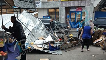 Фото: vk.com/barneos22 Буря повалила дерево на дорогу и торговые павильоны в Майминском районе Республики Алтай в воскресенье, 24 июля... amic.ru »