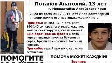 biwork.ru »Поисковый отряд ''Лиза Алерт'' опубликовал сообщение о розыске 13-летнего Анатолия Потапова жителя Новоалтайска. Мальчик ушел из дома 8 декабря... amic.ru »